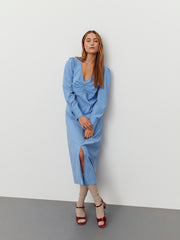 Gestreiftes Kleid von Sofie Schnoor in einem sehr angenehmen Material mit 30% Bambus und in „bauenblaustreifen“ Das Kleid hat einen seitlichen Reißverschluss, raffungen am Ausschnitt und einen Schlitz von.